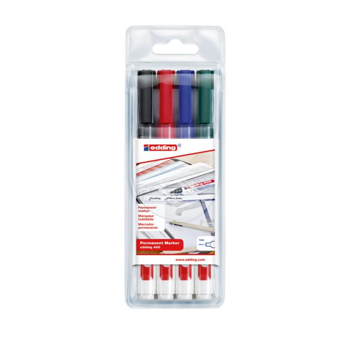 Permanentný popisovač vhodný na popisovanie, značenie a vyznačovanie takmer na všetky materiály vrátane kovu, skla a umelých hmôt. Plastový obal. Dopĺňateľný atramentom edding T 25. Okrúhly hrot, šírka stopy 1 mm. Dodávané v sade 4 ks.