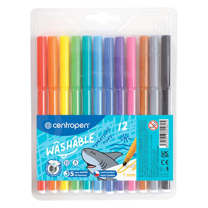 Popisovač vyrobený z PP s ventilačným bezpečnostným uzáverom a vláknovým hrotom odolným voči zatlačeniu. Šírka stopy 1,8 mm. Dodávaný v sade 12 farieb.