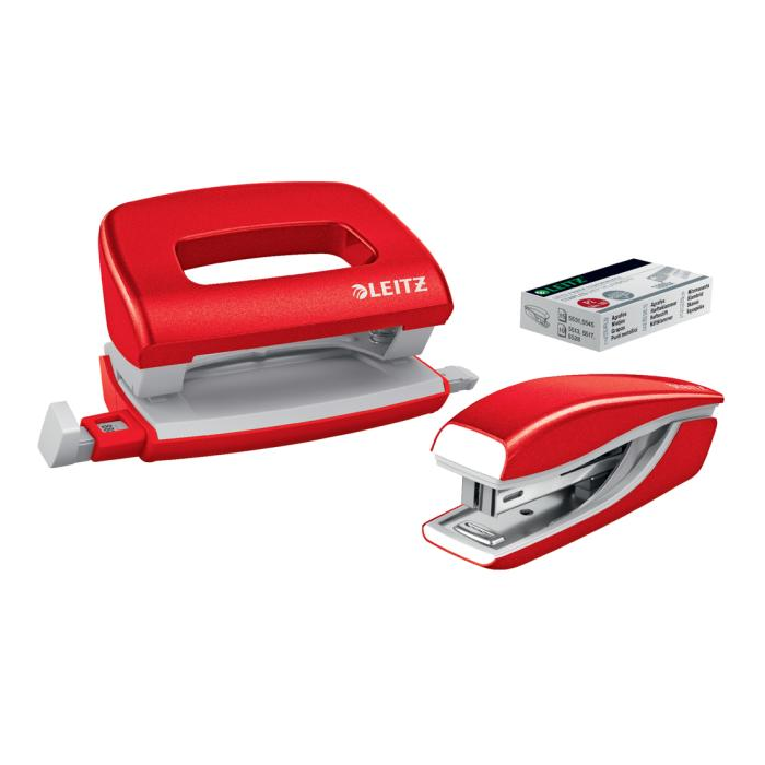 Minisúprava v moderných farbách. Malé a kompaktné rozmery. Kapacita 10 hárkov. Celokovová minizošívačka a dierovačka na použitie v kancelárii aj na cestách. Zošívačka s otvorením ramena o 180° na nástenkové zošívanie. Použite spinky Leitz Power Performance P2, č. 10, jedna škatuľka spiniek je súčasťou balenia. Dierovačka má príložník s kontrastnou potlačou jednotlivých formátov, rámček na jasné určenie formátu. Balenie v blistri. Farba červená.