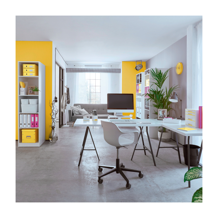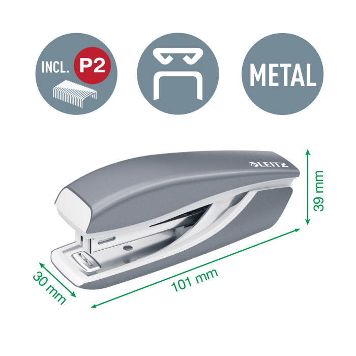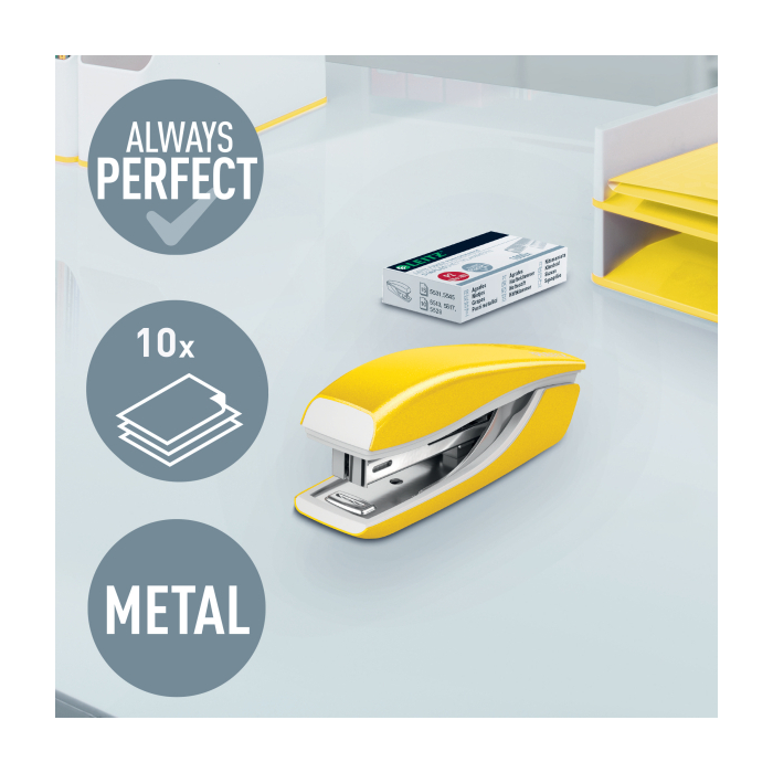 Minisúprava v moderných farbách. Malé a kompaktné rozmery. Kapacita 10 hárkov. Celokovová minizošívačka a dierovačka na použitie v kancelárii aj na cestách. Zošívačka s otvorením ramena o 180° na nástenkové zošívanie. Použite spinky Leitz Power Performance P2, č. 10, jedna škatuľka spiniek je súčasťou balenia. Dierovačka má príložník s kontrastnou potlačou jednotlivých formátov, rámček na jasné určenie formátu. Balenie v blistri. Farba žltá.