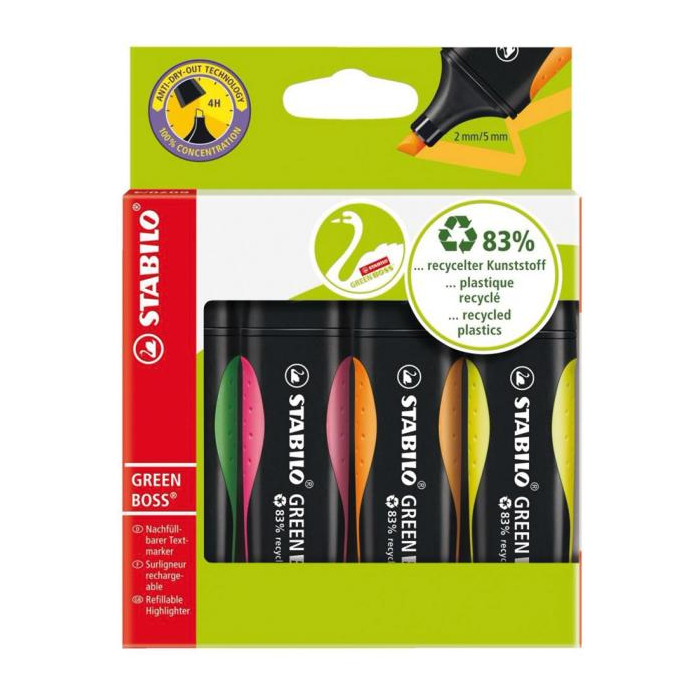 Zvýrazňovač STABILO GREEN BOSS je vyrobený z 83% recyklovaného plastu - ideálny pre školákov, študentov, učiteľov a kancelárskych pracovníkov, ktorí sú ohľaduplní k životnému prostrediu. Protišmyková zóna uchopenia zaisťuje bezpečné držanie pri značení. Technológia STABILO Anti-Dry-Out chráni pred vysychaním po dobu 4 hodín a zaisťuje koncentrovanú prácu. Značkovač je možné ľahko a pohodlne doplniť náplňami STABILO BOSS ORIGINAL. Balenie sada 4 kusy. Väčšie balenie 5 sád.