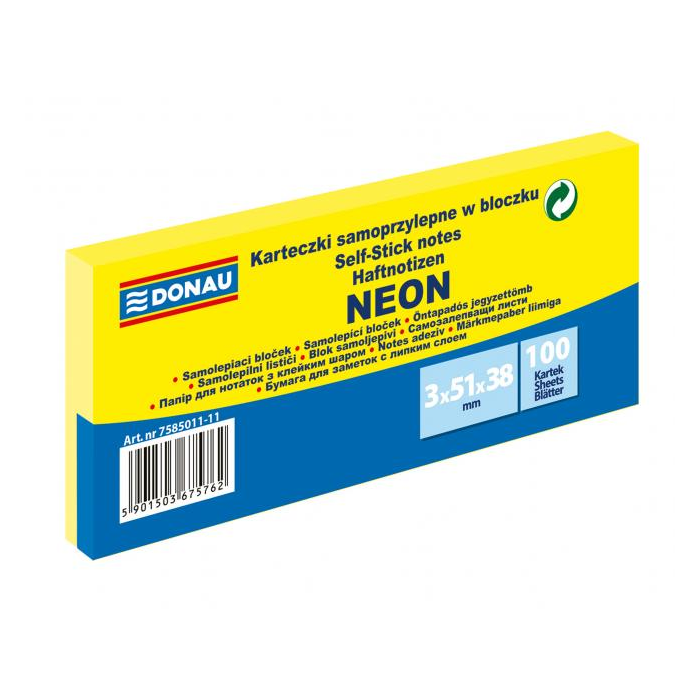 Univerzálne neónové samolepiace bločky z papiera gramáže 70 g / m², 100-lístkové, jednotlivo balené. Lepidlo nanesené po dlhšej strane, zmývateľné vodou. Udelený Green Point. 3 bločky vo fólii s červeným pruhom na uľahčenie otvárania. Väčšie balenie 36 ks. Farba neónovo žltá.