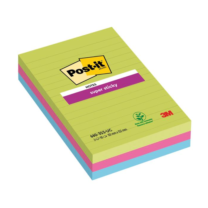 Samolepiaci bloček Post-it Super Sticky 101 mm x 152 mm XXL, dúhové farby, linajkové, 3 bločky po 90 lístkov