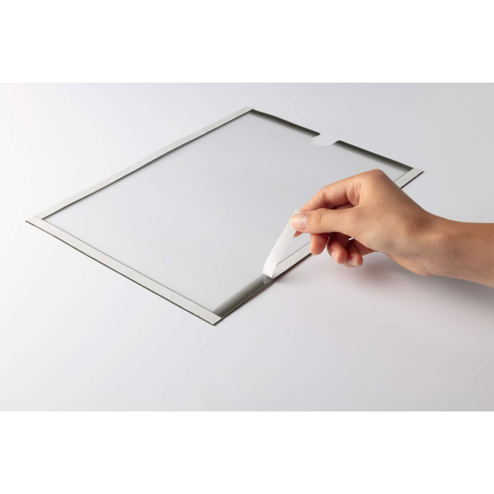 Držiak na dokumenty vo formáte A4 na pripevnenie pomocou troch lepiacich pásikov. Výrez na vkladanie a vyberanie dokumentov.