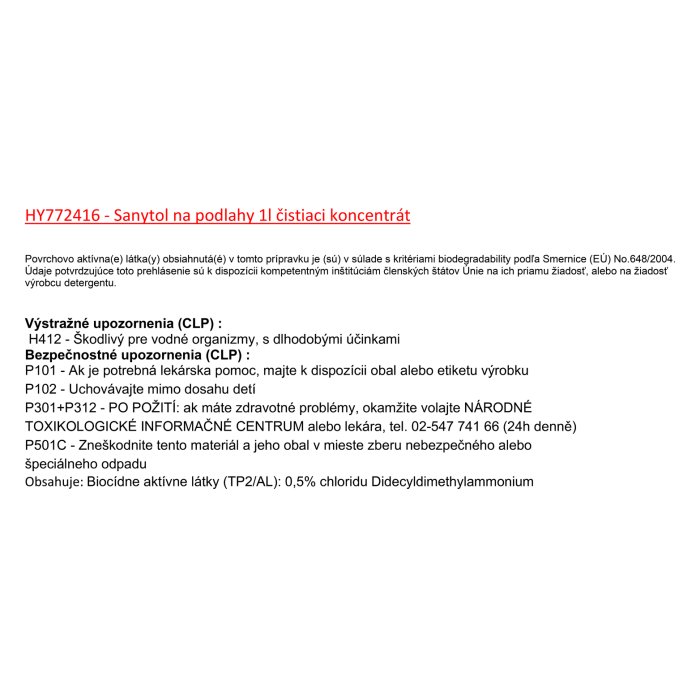 Obsahuje: Biocídne aktívne látky (TP2/AL): 0,5% chloridu Didecyldimethylammonium