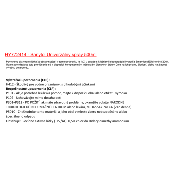 Obsahuje: Biocídne aktívne látky (TP2/AL): 0,5% chloridu Didecyldimethylammonium