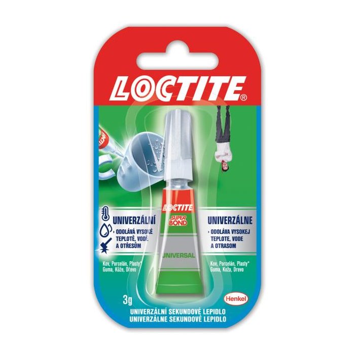 Sekundové univerzálne lepidlo s bezpečnostným uzáverom na keramiku, plasty, kovy, gumu, kožu, drevo, korok a pod. Lepí okamžite. Tento chemický prípravok je nebezpečný. Hmotnosť 3 g.