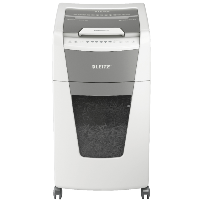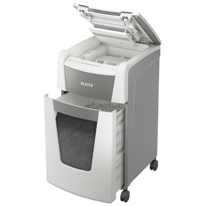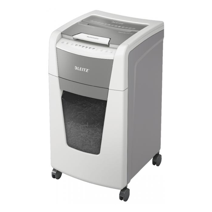 Plnoautomatická skartovačka na papier od firmy Leitz s jedinečnou čistou vyprázdňovacou funkciou. Je taká inteligentná, že potichu pracuje sama, len vložíte stoh papiera (vrátane kancelárskych sponiek a sponiek do zošívačky), zatvoríte veko a môžete ísť za svojou robotou. Ideálna na používanie v kanceláriách. Mimoriadne dôveryhodná a vysokovýkonná skartovačka s automatickým podávaním, s funkciou proti zaseknutiu papiera, tichá a s dlhou dobou prevádzky (60 minút). Automaticky skartuje 300 hárkov A4 na úrovni zabezpečenia P-5 (2 × 15 mm) s mikrorezom do veľkého 60l koša. Jednoduché ovládanie pomocou dotykových prvkov.
