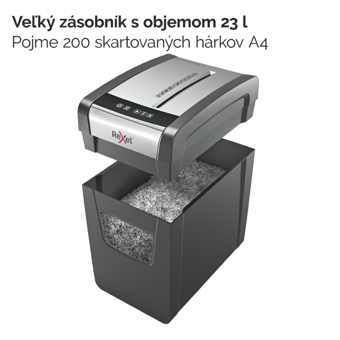 Nezastaviteľná skartovačka! Rexel Momentum X312-SL skartuje až 12 hárkov naraz a vydrží v nepretržitom chode 6 minút. Úzky dizajn vhodný na použitie doma. Technológia proti zaseknutiu papiera garantuje neprerušované skartovanie. Krížový rez na úrovni zabezpečenia P3 reže papier na časti s veľkosťou 5 × 42 mm. Dotykové ovládanie pre jednoduché a intuitívne ovládanie. Objemný kôš s kapacitou 23 l pojme 200 hárkov A4.