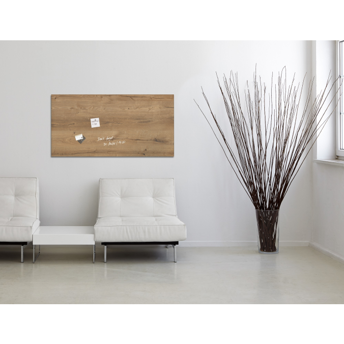 Magnetické tabule z tepelne tvrdeného bezpečnostného skla (EN 12150-1) hrúbky 15 mm s jednoduchou a bezpečnou montážou s certifi kátom TUV dodajú vašim kanceláriám, konferenčným miestnostiam, jedálňam i domácnostiam exkluzívny vzhľad. Sú popisovateľné kriedovými popisovačmi Sigel a za sucha zotierateľné utierkou z mikrovákna. Súčasťou balenia sú 3 super silné neodymové magnety a montážny materiál. Pri používaní príslušenstva Sigel je garantovaná 25-ročná záruka na magnetický sklenený povrch tabule. Rozmery 91 × 46 cm. Dizajn prírodné drevo.