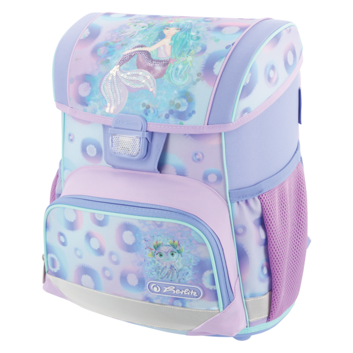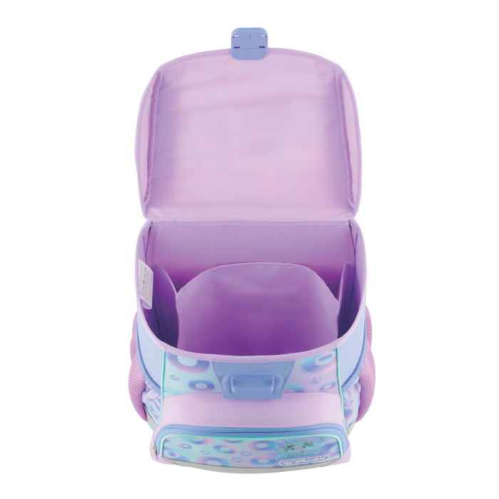 Školská taška s výbavou, ergonomicky tvarovaným a priedušným polstrovaním chrbta, nastaviteľnými ramennými popruhmi, výškovo nastaviteľným hrudným pásom, hlavným vreckom s priestorom na knihy, bočnými vreckami s elastickými pásikmi, predným vreckom na zips, stabilnou spodnou doskou s nožičkami, pohodlnou rukoväťou a reflexnými prvkami Oralite. Hmotnosť 950 g, objem 16 l, rozmery 37 x 31 x 22 cm. Vode-odolná, bez PVC, výbava: peračník, vrecko na prezuvky, okrúhle puzdro. Certifikát ergonómie 2023 a 2025. Materiál: polyester.