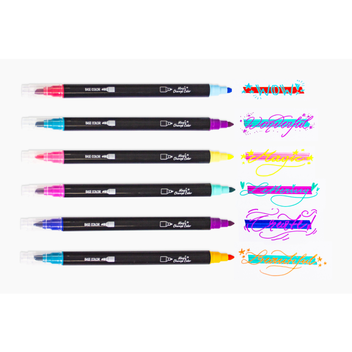 Zvýrazňovač s funkciou zmeny farby. Obojstranný zvýrazňovač s hrotom v tvare sekáča (základná farba) a okrúhlym hrotom (magická farba). Najprv zvýraznite text základnou farbou (hrot v tvare sekáča) a nechajte ho krátko zaschnúť. Potom zvýraznite jednotlivé slová druhým hrotom; farba sa magicky zmení. 6 rôznych farieb. Dĺžka pera 16,4 cm, vetrané uzávery. Šírka čiary hrotom v tvare sekáča 1 - 4 mm. Balené v puzdre s pútkom na zavesenie v európskom štýle.