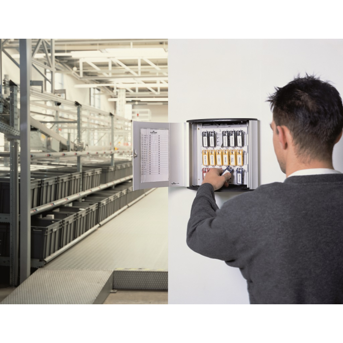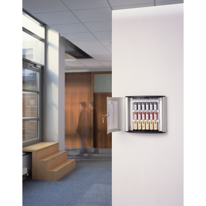 Skrinka na 18 kľúčov s dvierkami, otvárajúcimi sa z dôvodu lepšej obsluhy v 180° uhle. Jednoduchá montáž na stenu. Súčasťou balenia je montážna sada, 2 bezpečnostné kľúče a 6 menoviek na kľúče v rôznych farbách. Farba strieborná. Výška: 28 cm