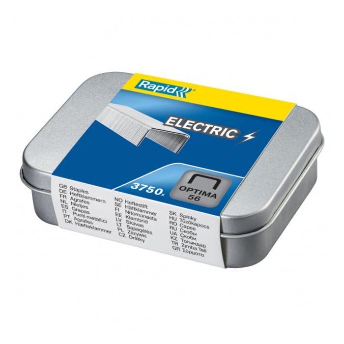 Ultraostré drôtiky Optima 56 sú vyrobené z kvalitnej ocele a ľahko prerazia až 20 hárkov. V spojení s elektrickými zošívačkami Rapid Optima Grip a Optima 20 zaručujú presné zošívanie bez zasekávania. K dispozícii v baleniach po 3750 ks. Dodávajú sa v šikovnej hliníkovej plechovke s bezpečne uzatvárateľným viečkom. Špeciálne drôtiky pre elektrické zošívačky Rapid Optima Grip a Optima 20.