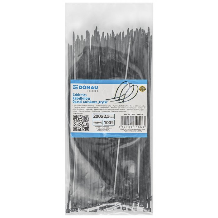 Sťahovacia páska na káble DONAU TECH 200x2.5mm, 100ks, čierna