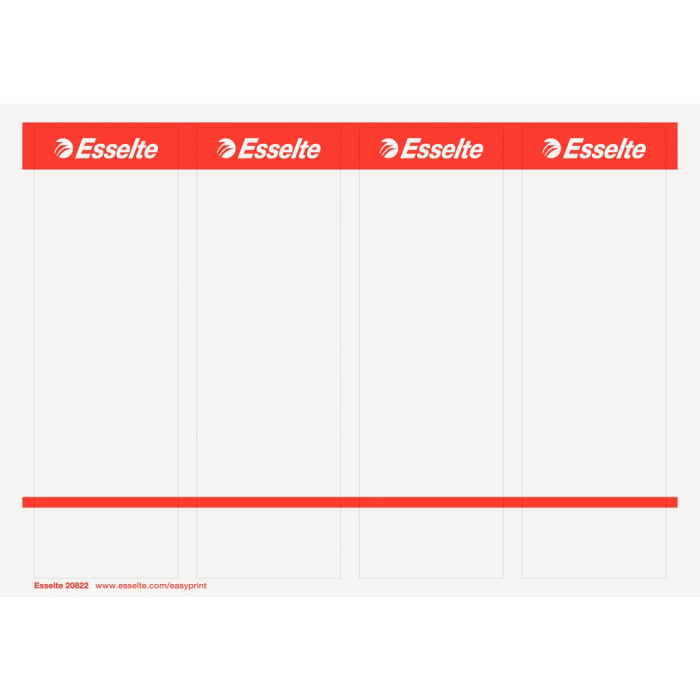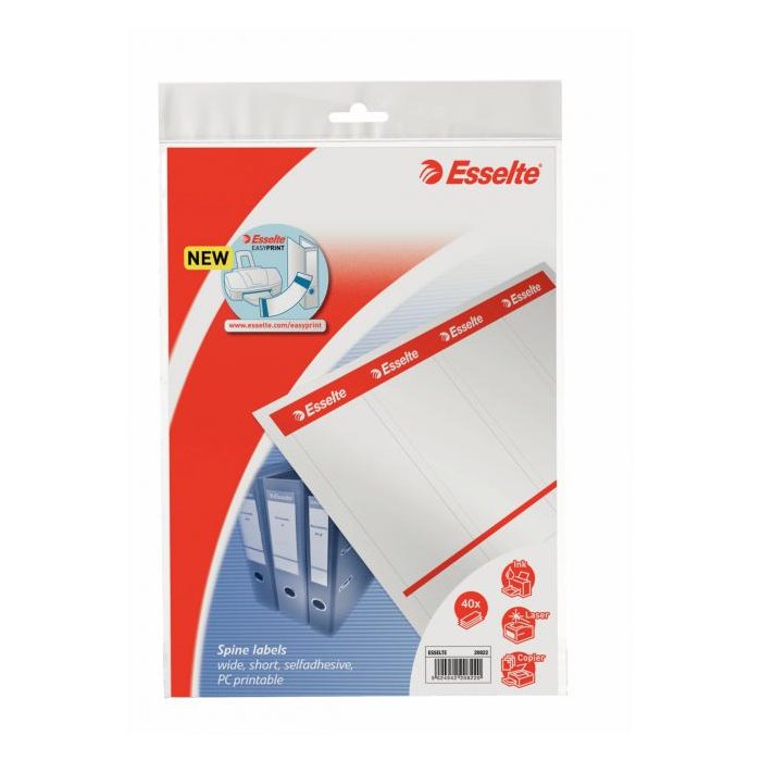 Náhradné samolepiace papierové chrbtové štítky na páíkové kartónové zakladače Rainbow a Mramor, šírky chrbta 7,5 cm na identifikáciu založených dokumentov. Štítky sú vhodné na potlač do laserových a atramentových tlačiarní a kopíriek cez jednoduchý internetový nástroj `EASYPRINT` na stránke www.esselte.com/easyprint. V balení 10 hárkov (á 4 štítky/hárok) s predperforovanými štítkami rozmeru 59 x 192 mm. Hmotnosť papieru 80 g/m2. Farba biela .
