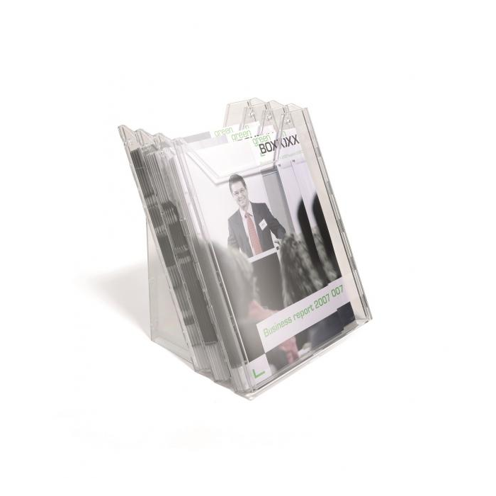 Kombinovaný stojan s tromi odkladačmi na prospekty a časopisy formátu A4 s tromi odkladačmi a závesným dielom na stenu, resp. stôl. Materiál priehľadný plast. Hrúbka 24 mm. Vnútorné rozmery 240 × 311 mm.