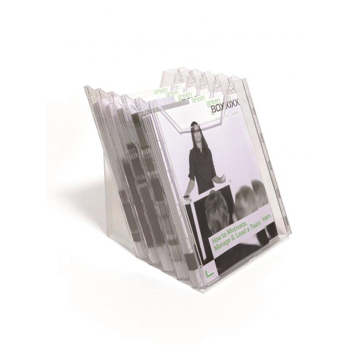 Stojan na prospekty a časopisy formátu A4 s piatimi odkladačmi a závesným dielom na stenu, resp. stôl. Materiál priehľadný plast. Hrúbka 24 mm. Vnútorné rozmery max. 240 × 311 mm.