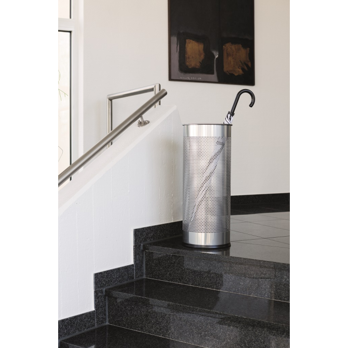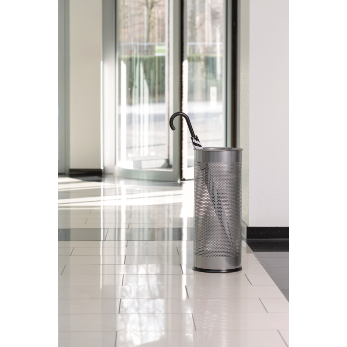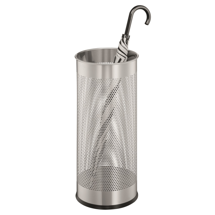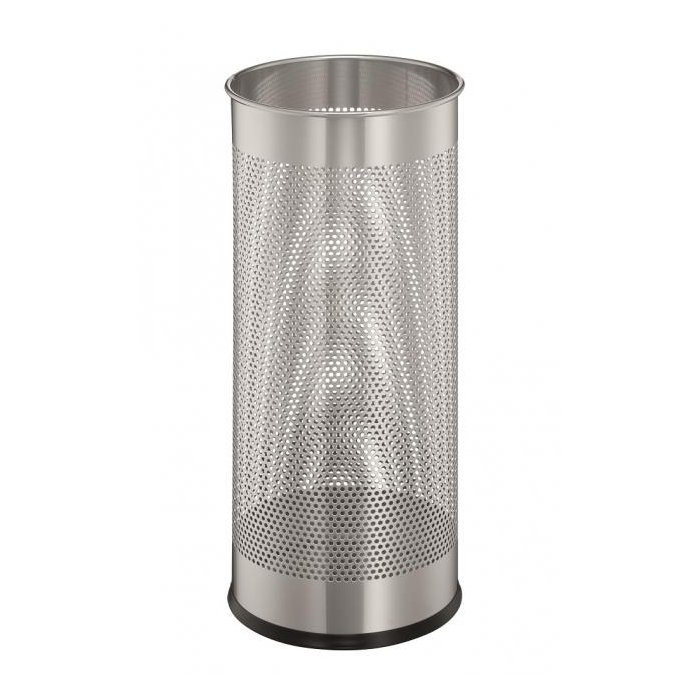 Štýlový stojan na dáždniky vysokej kvality s dekoratívnou perforáciou vyrobený z ocele. Ideálny do vstupných priestorov, domácností a kancelárií. Objem 28,5 l, výška 620 mm, priemer 260 mm. Materiál: oceľ Farba: strieborná
