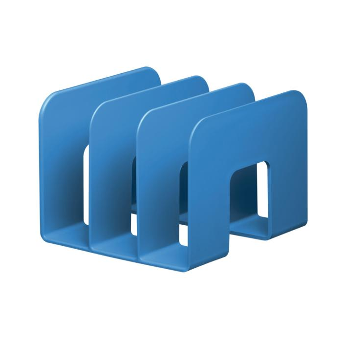 Trojpriehradkový stojan na katalógy pre flexibilné použitie. Vyrobený z recyklovaných plastov v kvalite Blue Angel. Priehradky široké 65 mm. Jednoduché zasúvanie a vyberanie. Vhodný pre časopisy, brožúry, katalógy atď. Rozmery: 215 x 165 x 210 mm (Š x V x H). Farba modrá.