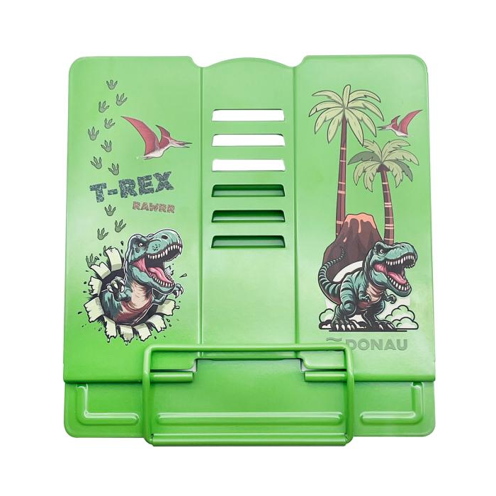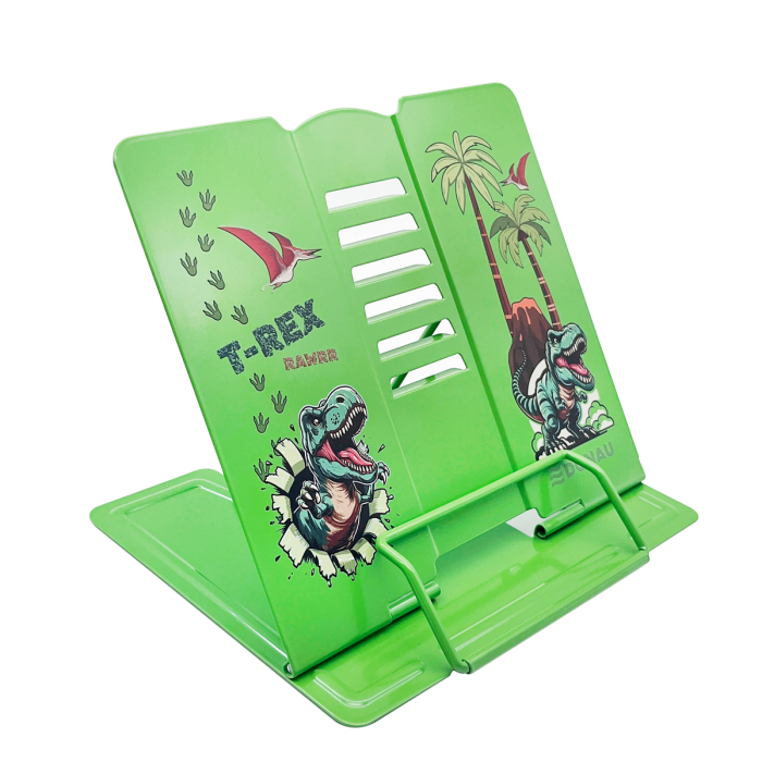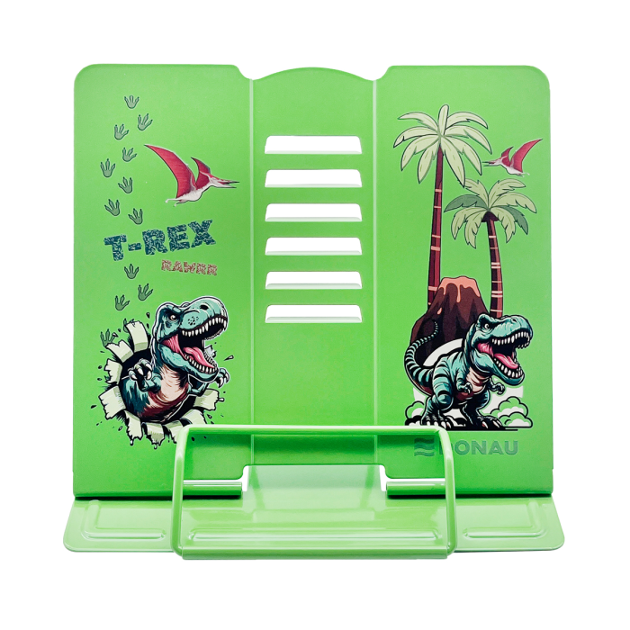 Kvalitný stojan na knihy, učebnice alebo tablet s atraktívnou potlačou Dino T-Rex. Vyrobený z odolného lakovaného kovu, ideálny aj pre ťažšie knihy. S protišmykovými úchytmi, nastaviteľná výška a uhol sklonu v 5 stupňoch. Keď sa nepoužíva, zloží sa úplne naplocho. Súčasťou je aj praktická zarážka na otvorenú stránku. Využitie nájde doma, v škole, v kuchyni, v kancelárii či ako stojan na noty. Rozmery: základňa: 21 × 16,5 cm, výška: 15,7 cm.