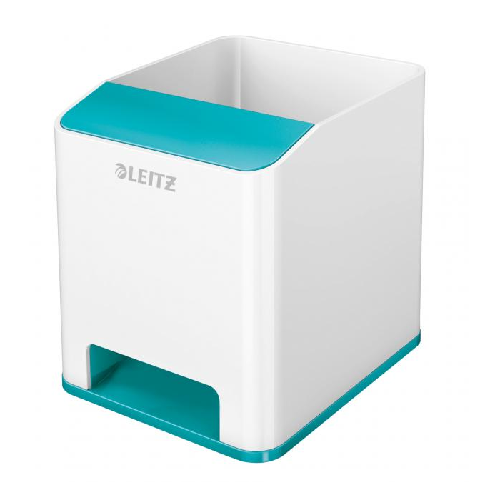 Neprehliadnuteľný štýlový stojan na perá v prémiovej kvalite Leitz v štýlových žiarivých farbách WOW. Extra odkladač pre smartphone do veľkosti iPhone 6 plus so špeciálnou funkciou pre zosilovanie zvuku, veľa miesta pre písacie potreby, pravítko, stylus a iné drobnosti. Moderný dizajn, ktorý vyzerá rovnako dobre v kancelárii, ako aj doma na pracovnom stole, dobre dopĺňa ostatné produkty radu WOW. Farba ľadová modrá.