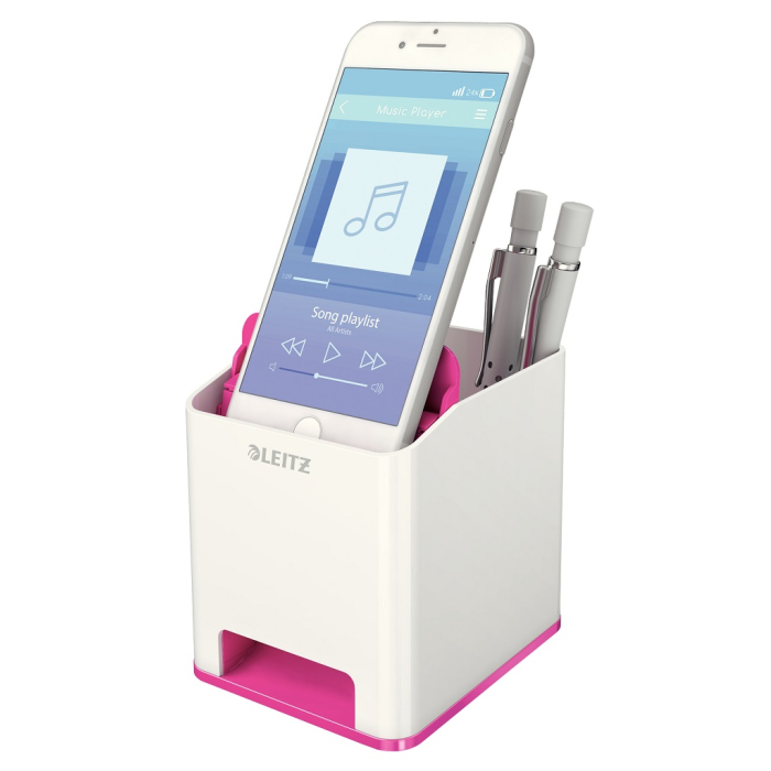 Neprehliadnuteľný štýlový stojan na perá v prémiovej kvalite Leitz v štýlových žiarivých farbách WOW. Extra odkladač pre smartphone do veľkosti iPhone 6 plus so špeciálnou funkciou pre zosilovanie zvuku, veľa miesta pre písacie potreby, pravítko, stylus a iné drobnosti. Moderný dizajn, ktorý vyzerá rovnako dobre v kancelárii, ako aj doma na pracovnom stole, dobre dopĺňa ostatné produkty radu WOW.