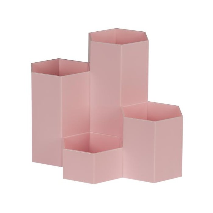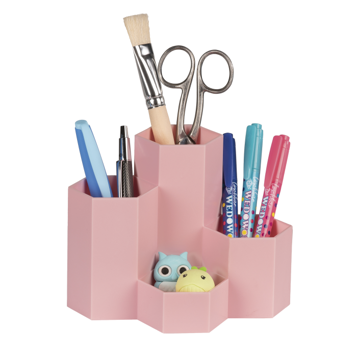 Stojan na perá so šesťuholníkovými trubicami je vyrobený z mimoriadne odolného a nárazuvzdorného polypropylénu. Vďaka tvaru včelieho plástu ho možno zoskupiť, aby sa ušetrilo miesto. 4 trubice, usporiadané v rôznych výškach, ponúkajú voľný priestor na pravítka, štetce, nožnice, perá a samozrejme aj na menšie predmety na stole, ako sú strúhadlá a gumy.