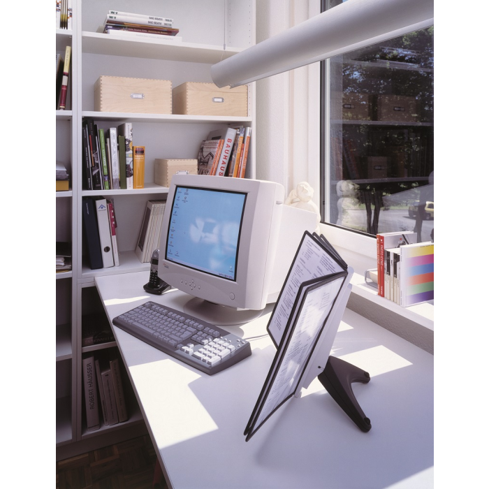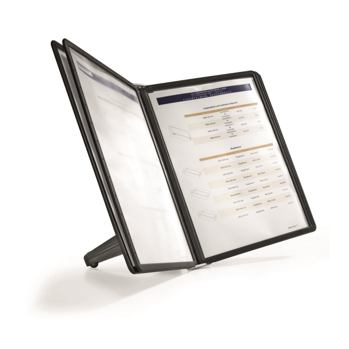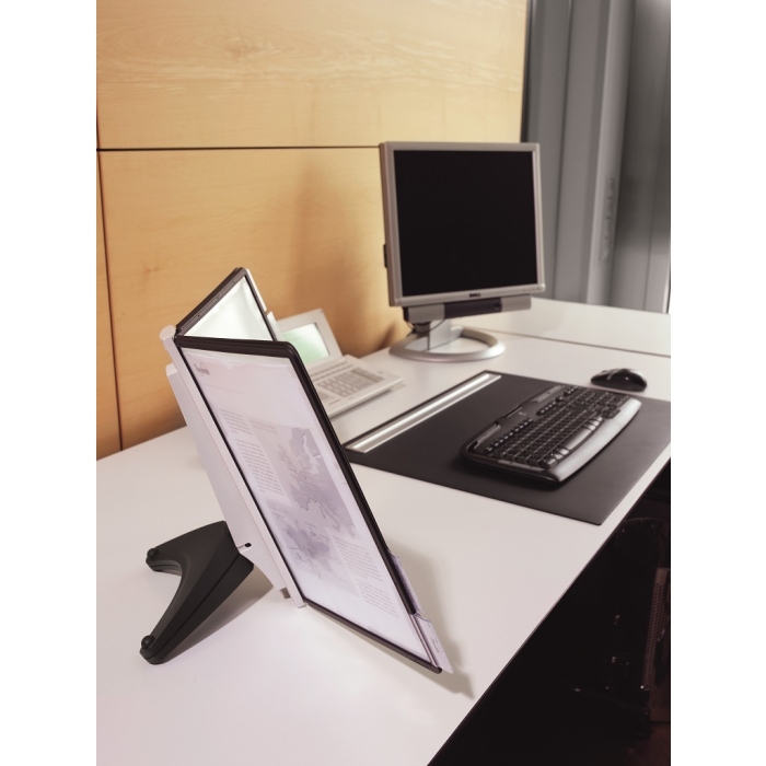 Stojan na stôl s 5 polypropylénovými displejovými panelmi formátu A4 do malých kancelárií. Stabilná základňa, systém ideálny pre užívateľov, ktorí sú obmedzení nedostatkom miesta. Farba základne i panelových rámčekov čierna. Kapacita panelov: 5 Dodávaný: s panelmi Farby panelov: čierna