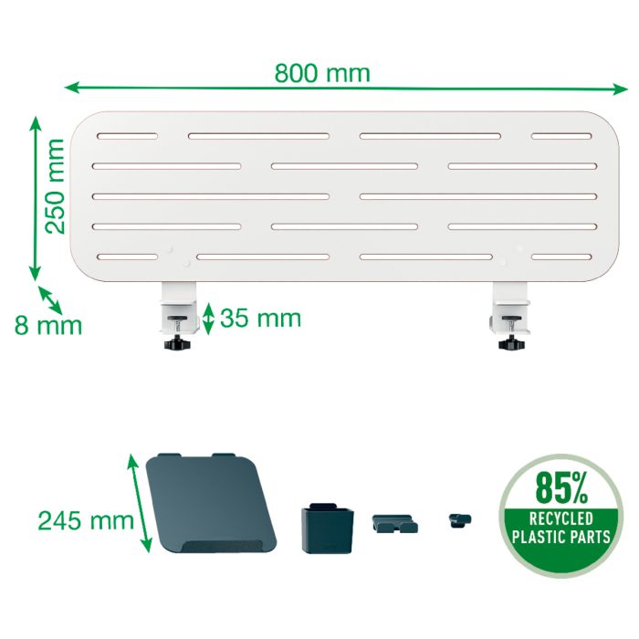 Obsah: Dierovaná doska a príslušenstvo vyrobené z 85 % z recyklovaného plastu: držiak na notebook (vhodný aj pre MacBooky), držiak na pero, držiak na smartfón a háčik
