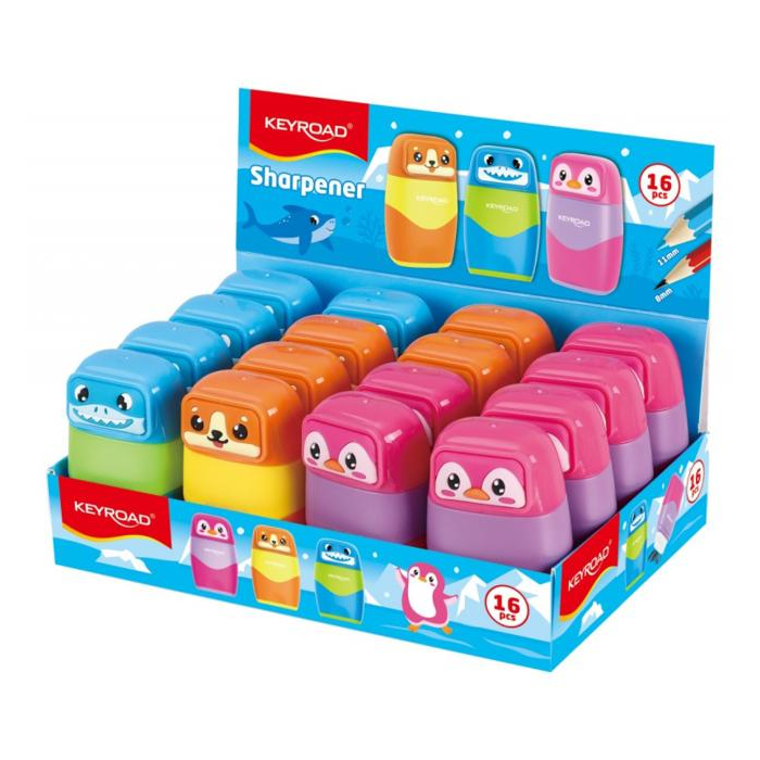 Strúhadlo plastové KEYROAD s 2 otvormi a gumou v kreslenom dizajne, displej 16 ks