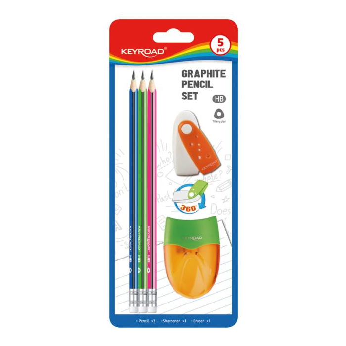 Súprava školských pomôcok KEYROAD, 5 ks: ceruzky 3 ks, strúhadlo 1 ks, guma 1 ks. Balenie: blister. Mix farieb.