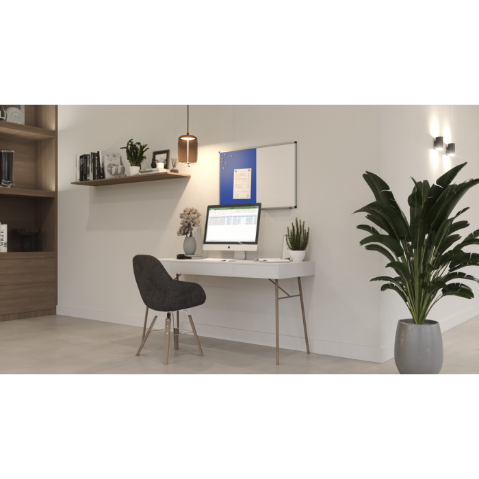 Priestorovo úsporná dvojfunkčná doska na písanie a pripínanie. Hladké písanie a výkon suchého vymazávania. Jednoduché pripevnenie poznámok, náčrtov a fotografií pomocou magnetov a špendlíkov. Jednoduchá skrytá montáž na stenu. 5 ročná záruka na dokonalú popisovateľnosť a stierateľnosť povrchu dosky pri použití v kombinácii s príslušenstvom Legamaster. Tento produkt je vyrobený z materiálu z dobre obhospodarovaných lesov s certifikátom FSC® a iných kontrolovaných zdrojov (FSC C158462). Funkčná tabuľa a nástenná tabuľa na príležitostné použitie v kancelárii alebo domácej kancelárii. Jedna polovica: Magnetická lakovaná oceľová tabuľa vhodná na popisovanie za sucha stierateľnými popisovačmi na tabuľu. Druhá polovica: Nástenka s plsteným povrchom. Hliníkový rám so sivými plastovými rohovými krytmi (Pantone 433C). Možno namontovať horizontálne alebo vertikálne. Zásobník na popisovace (30 cm) s koncovými krytmi, montážna sada a montážny návod sú súčasťou balenia.