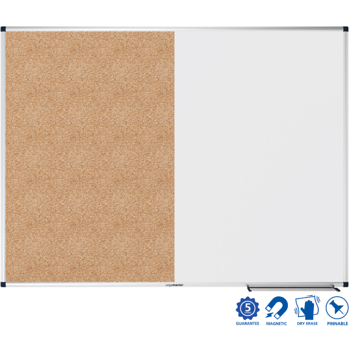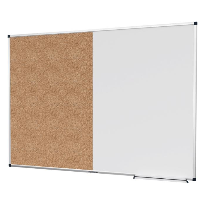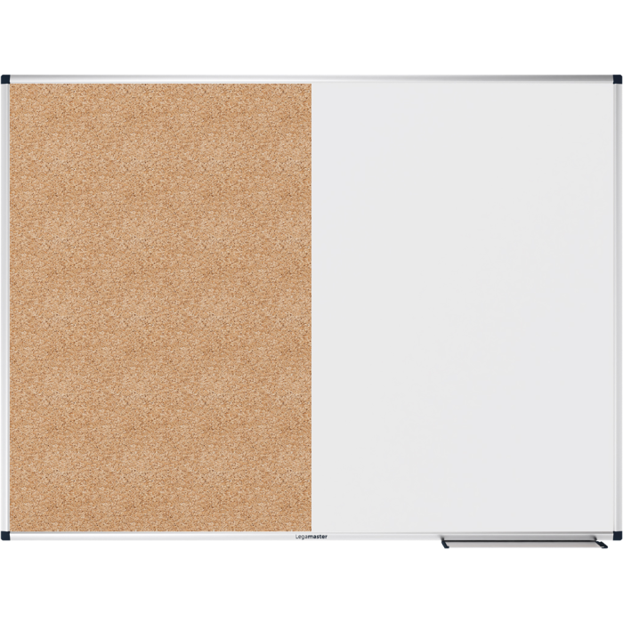 Funkčná tabuľa a nástenná tabuľa na príležitostné použitie v kancelárii alebo domácej kancelárii. Jedna polovica: Magnetická lakovaná oceľová tabuľa vhodná na popisovanie za sucha stierateľnými popisovačmi na tabuľu. Druhá polovica: Nástenka s povrchom z prírodného korku. Hliníkový rám so sivými plastovými rohovými krytkami (Pantone
