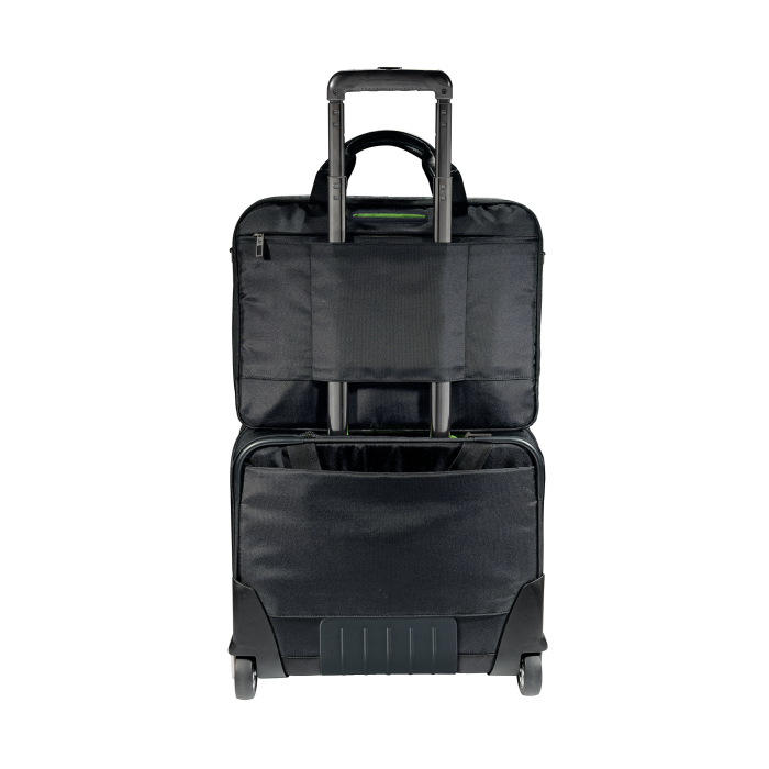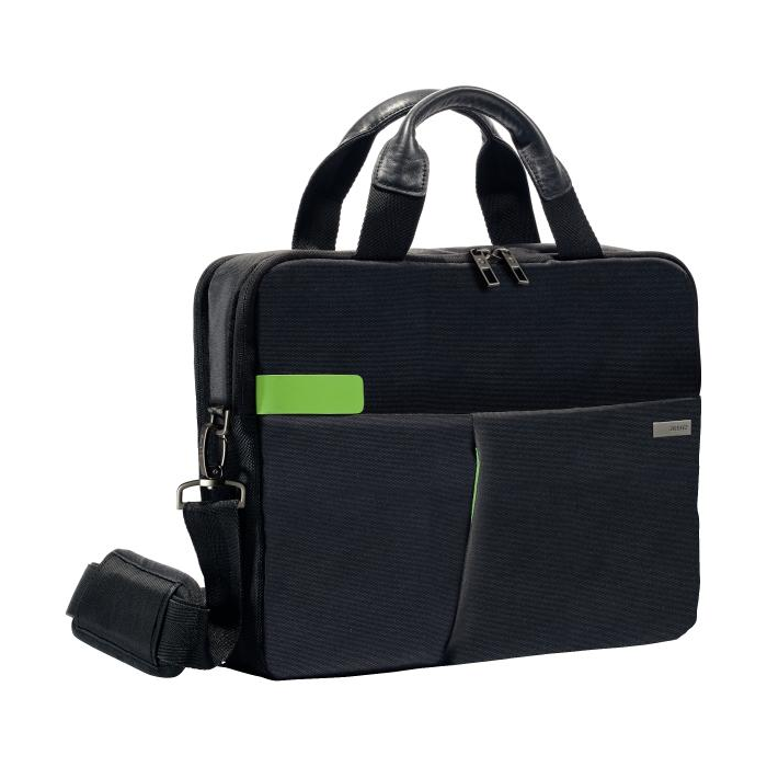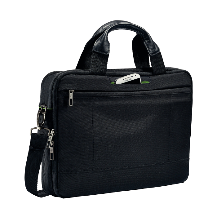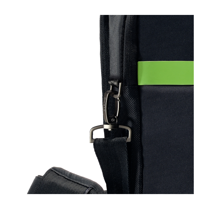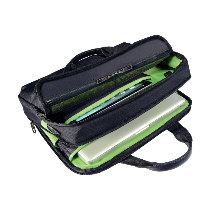 Kvalitná, ľahká a kompaktná taška s dvoma hlavnými a jednou menšou prednou kapsou. Výrazný a elegantný dizajn dopĺňajú kvalitné zipsy a štýlové matne kovové pracky. Čierny povrch s kontrastným zeleným vnútrajškom, aby sa predmety ľahšie hľadali. Taška ponúka miesto na všetky vaše mobilné zariadenia, 13,3` notebook a dokumenty do formátu A4. Je možné pohodlne nosiť vďaka vystlaným rukovätiam z pravej kože alebo nastaviteľnému ramennému popruhu, prípadne upevniť na držadlo pojazdného kufra. Farba čierna/zelená.