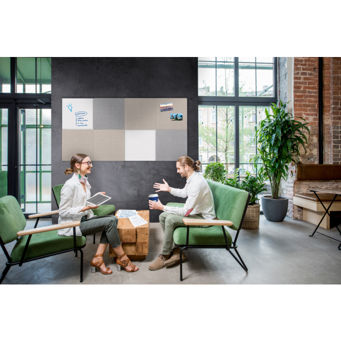 Bezrámová zvuk pohlcujúca nástenná tabuľa, ktorá zlepšuje akustiku v miestnosti. Jednoduchá montáž na stenu pomocou magnetických dosiek, hmoždiniek a skrutiek. Rozmer 75 x 50 cm. Farba jemná béžová.