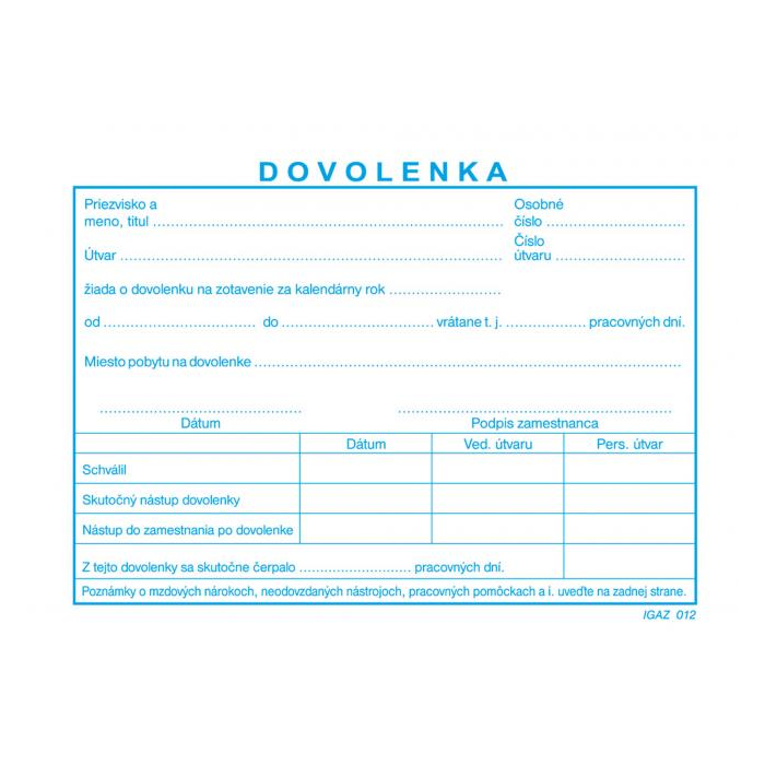 Tlačivo z oblasti práce a mzdy. Dovolenka, A6, blok, 100 listov.
