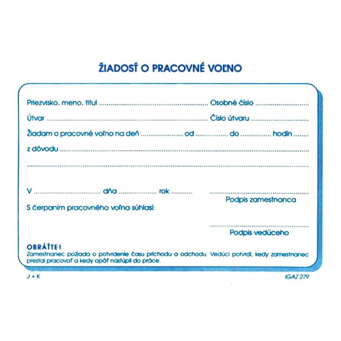 Tlačivo Žiadosť o pracovné voľno, blok formátu A6, 100 listov.