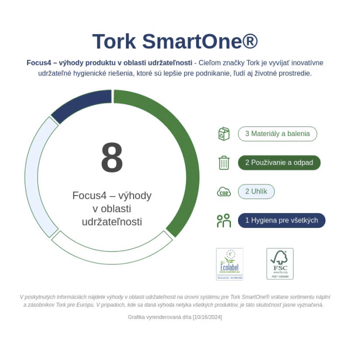 Tork SmartOne® Twin mini zásobník na toaletný papier v dizajne Elevation je moderný a efektívny systém zásobníkov vhodný pre náročné toalety a umyvárne s vysokou návštevnosťou. Tým, že sa doň zmestia dva kotúče, a dávkovaním po útržkoch, pomáha znižovať spotrebu až o 40 % v porovnaní s tradičnými jumbo kotúčovými zásobníkmi, čo znamená viac návštev na jeden kotúč. Zásobníky Tork Elevation majú praktický a moderný dizajn, ktorý zanecháva v hosťoch dlhodobý dojem.