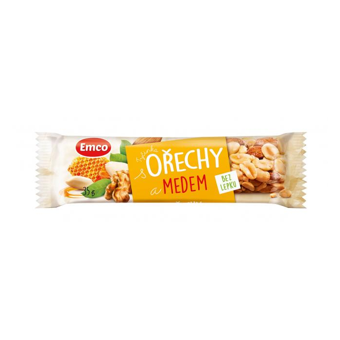 Pražené arašidy 45 %, sirup z invertného cukru, pražené mandle 13,5 %, maltózový sirup, pražené vlašské orechy 7 %, extrudované cereálie (kukuričná múka, ryža, cukor, jedlá soľ), dextróza, med kvetový 2,7 %, ryžová múka, emulgátor: slnečnicový lecitín, jedlá soľ.