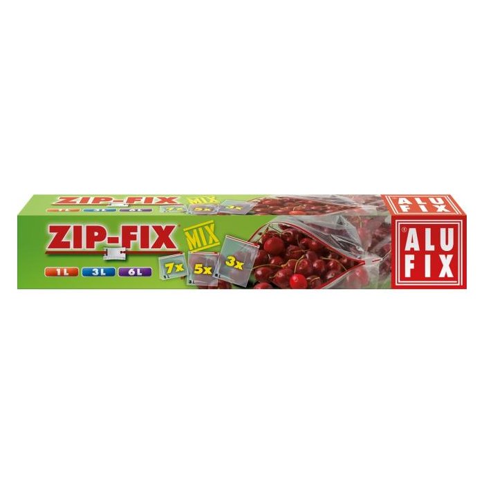 Zipové univerzálne vrecká v rôznych rozmeroch 1l x 7ks, 3l x 5ks a 6l x 3ks, spolu 15 ks. Vrecká sú hrubé so zipsovým uzáverom ZIP-FIX a tak dokonale chránia a udržujú potraviny čerstvé a sú vhodné aj do mrazničky. Vhodné na viacnásobné použitie.