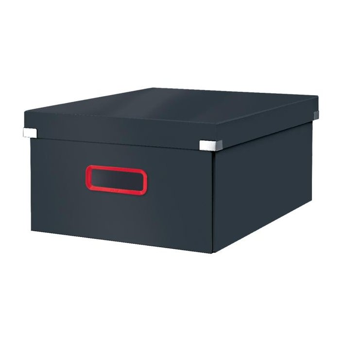 Univerzálna úložná krabica Leitz Cosy Click & Store s vekom má praktický štýlový červený otvor na jednoduché uchopenie a prenášanie, je vhodná na dokumenty až do formátu A3 a na iné väčšie predmety, ako je klávesnica alebo notebook. Je ideálna na uloženie čohokoľvek z domácej kancelárie alebo na uloženie osobných vecí pri hot-deskingu (striedanie pracovného miesta v kancelárii). Krabicu môžete opätovne rozložiť/zložiť, keď sa nepoužíva. Prémiová kartónová krabica Leitz Cosy Click & Store je ideálna na udržiavanie poriadku doma i v kancelárii a pomáha vám rýchlo a jednoducho si zorganizovať prácu. Formát A3. Farba sivá.