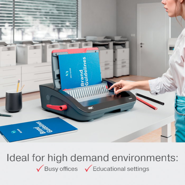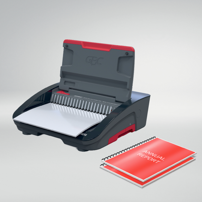 • špičkový elektrický viazač s plastovými chrbtami, navrhnutý pre náročné prostredia ako sú rušné kancelárie a vzdelávacie inštitúcie