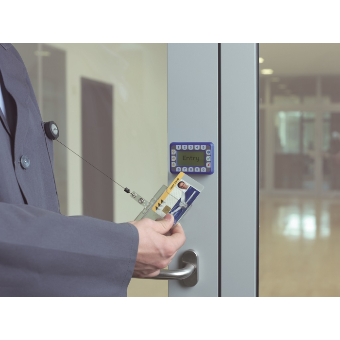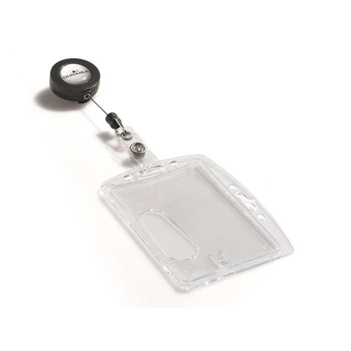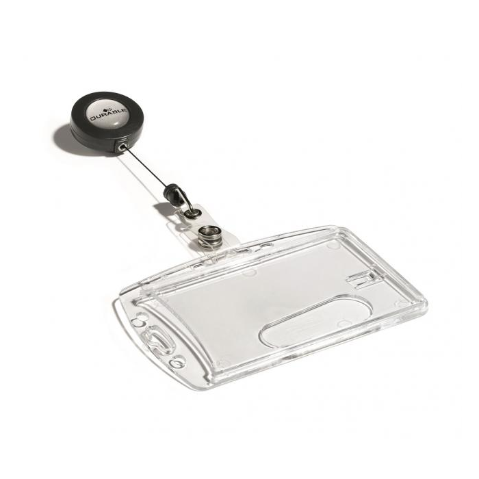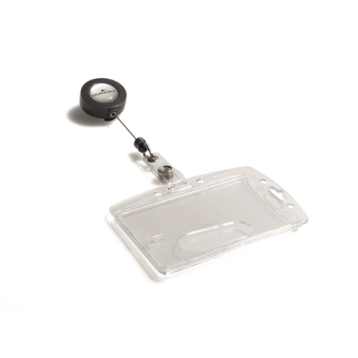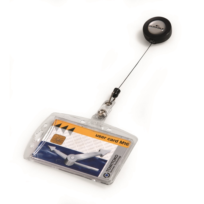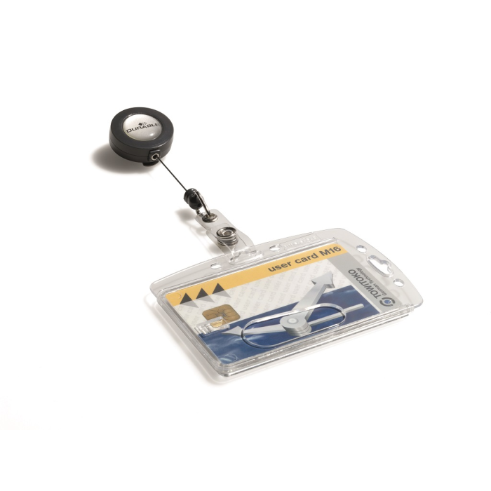 Visačka na jednu plastovú identifikačnú kartu z priehľadného plastu, ktorý chráni kartu pred poškodením. S otvorom na palec na rýchle a jednoduché vysunutie karty. Plastová visačka s výsuvným kotúčikom čiernej farby s kovovým klipom a možnosťou vysunutia do 80 cm. Balenie 10 ks. Rozmery š × v: 85 × 54 mm