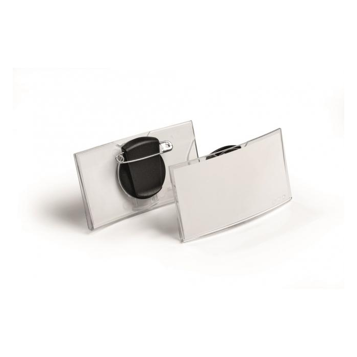 Elegantná visačka z pevného plastu s lesklým povrchom a vertikálnym zaoblením. Oblý tvar spoľahlivo zabráni vypadnutiu menovky a zlepšuje výhľad na menovku. Uchytenie visačky na zadnej strane širokým pevným štipcom alebo zatváracím špendlíkom. Náhradné papieriky obj. kód DU145302. Balenie 25 ks. Rozmery: 75 x 40 mm