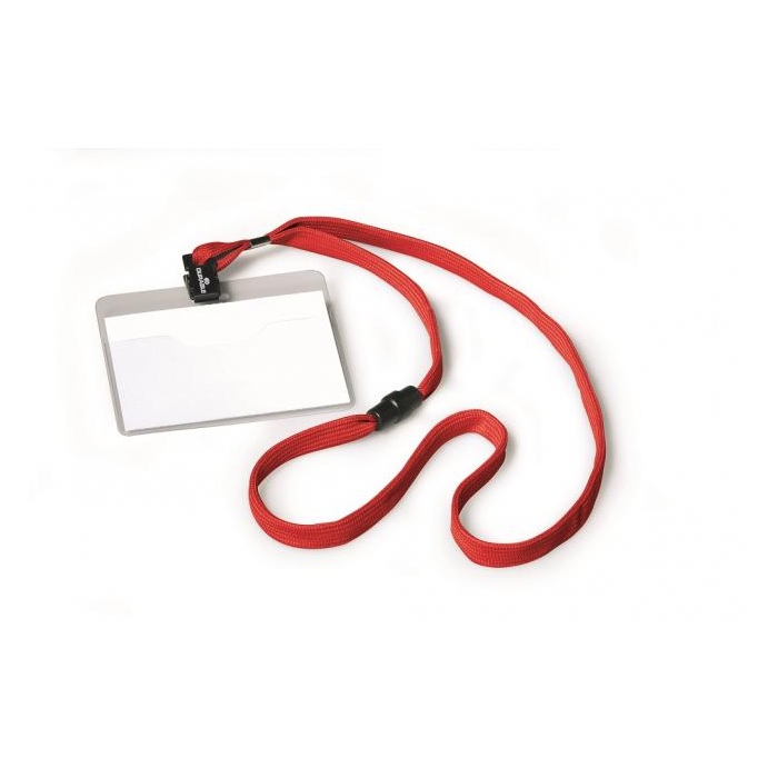 Visačka na krk s farebným bezpečnostným remienkom dĺžky 44 cm. Poistka na remienku sa uvoľní pri zachytení remienka alebo silnom potiahnutí. Materiál pevné priehľadné PVC, závesný remienok šírky 10 mm. Balenie 10 ks. Náhradné papieriky DU145602. Rozmery visačky: 90×60 mm Farba remienka: červená