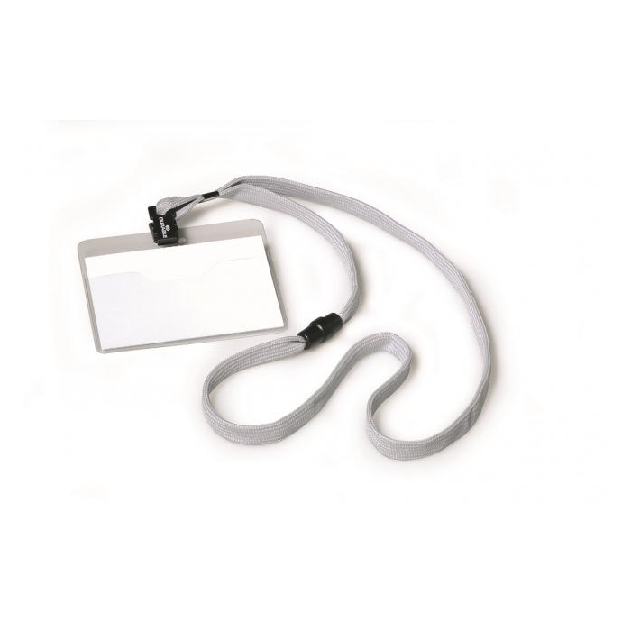 Visačka na krk s farebným bezpečnostným remienkom dĺžky 44 cm. Poistka na remienku sa uvoľní pri zachytení remienka alebo silnom potiahnutí. Materiál pevné priehľadné PVC, závesný remienok šírky 10 mm. Balenie 10 ks. Náhradné papieriky DU145602. Rozmery visačky: 90×60 mm Farba remienka: sivá