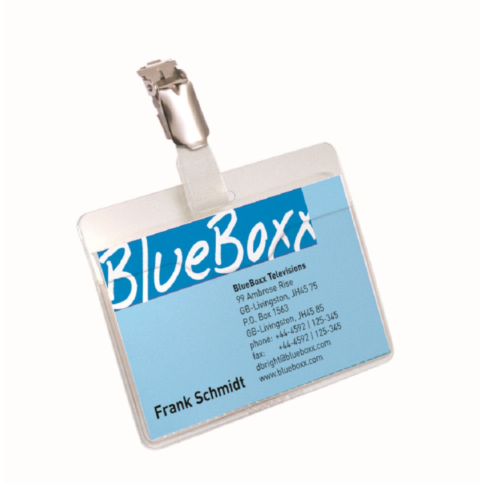 Priehľadná visačka s európskym štipcom, umiestneným na dlhšej strane visačky. Dodávaná s papierovou kartičkou rozmerov 90×60 mm. Model, pri ktorom možno menovku vyberať bez potreby odnímania štipca s remienkom. Balenie 25 ks. Farba transparentná. Rozmery: 90 x 60 mm