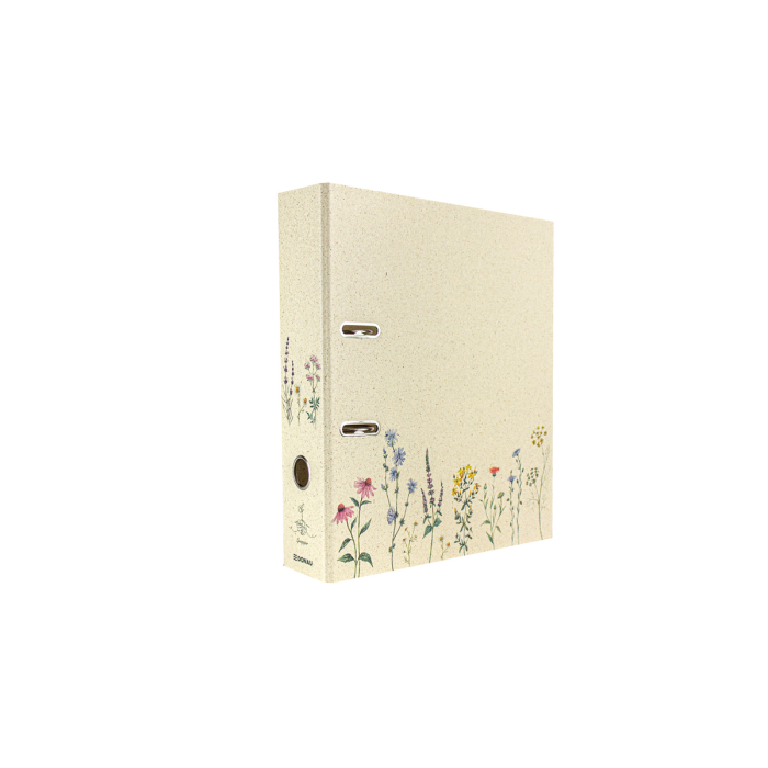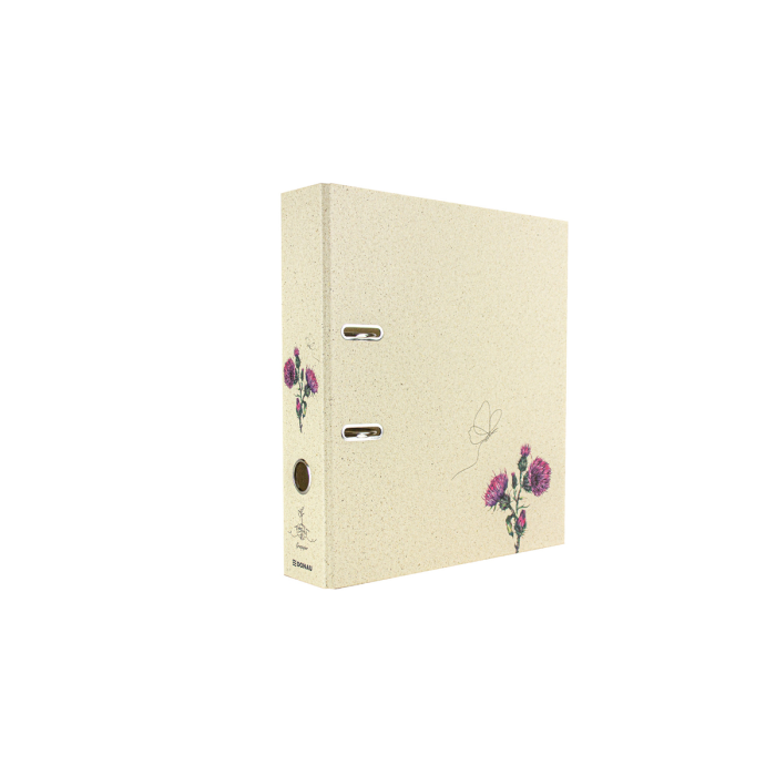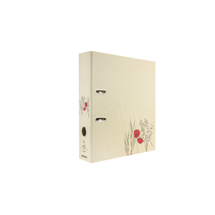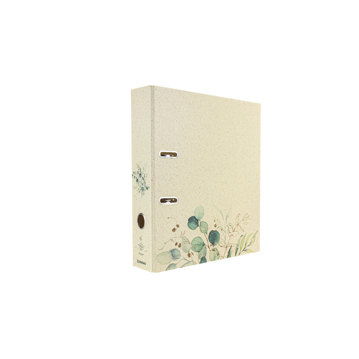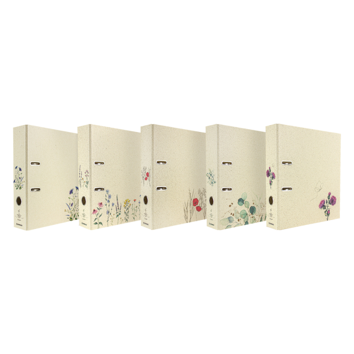 5 vzorov rôznych farieb, vonkajší materiál trávový papier, farebná potlač, vnútorná sivá doska 2,1 mm, vnútorná podšívka prírodný trávový papier, do školy, na univerzitu alebo na uloženie dokumentov z hobby, dovolenky... pre formát DIN A4, šírka chrbta 70 mm, s pákovým mechanizmom, otvorom na prst a priestorovo úspornými očkami (Rado).