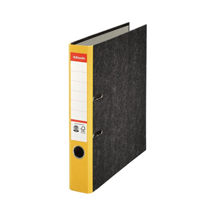 Štruktúrovaný papierový poťah s čiernym mramorovým vzorom, formát A4. Zakladač vybavený rado zámkom a nalepeným chrbtovým štítkom. Páková mechanika v dizajne MATT s prítlačnou lištou. Šírka chrbta 5 cm. Balenie 25 ks. Chrbát: 5 cm Farba: žltá